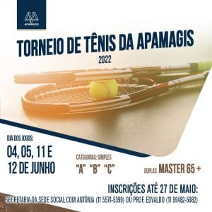 O Departamento de Esportes da Apamagis promove nos dias 4, 5, 11 e 12/6 o Torneio de Tênis 2022, nas quadras da sede social. As inscrições podem ser feitas até o dia 27/5.