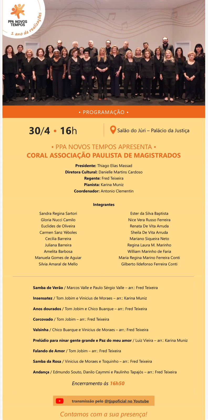 Criado pelo Tribunal de Justiça do Estado de São Paulo, o PPA – Programa de Preparação à Aposentadoria “Novos Tempos” está completando um ano. Para celebrar, será realizada solenidade no dia 30/4, às 14h, no Palácio da Justiça, com presença da Coordenadora do PPA, Desembargadora Maria de Lourdes Lopez Gil Cimino. O evento contará com apresentação do Coral da Associação Paulista de Magistrados e será transmitido ao vivo pelo canal do TJSP no YouTube.