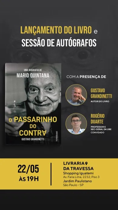 O Desembargador do TJRJ Gustavo Grandinetti irá lançar, na próxima quinta-feira (22/5), às 19h, seu livro “O Passarinho do Contra – Uma Biografia de Mario Quintana” (Ed. Tordesilhas). O lançamento será realizado na Livraria da Travessa do Shopping Iguatemi (Av. Brigadeiro Faria Lima, 2.232 – piso 3) e contará com a presença do Professor e Secretário-Geral da UBES (União Brasileira de Escritores), Rogério Duarte.