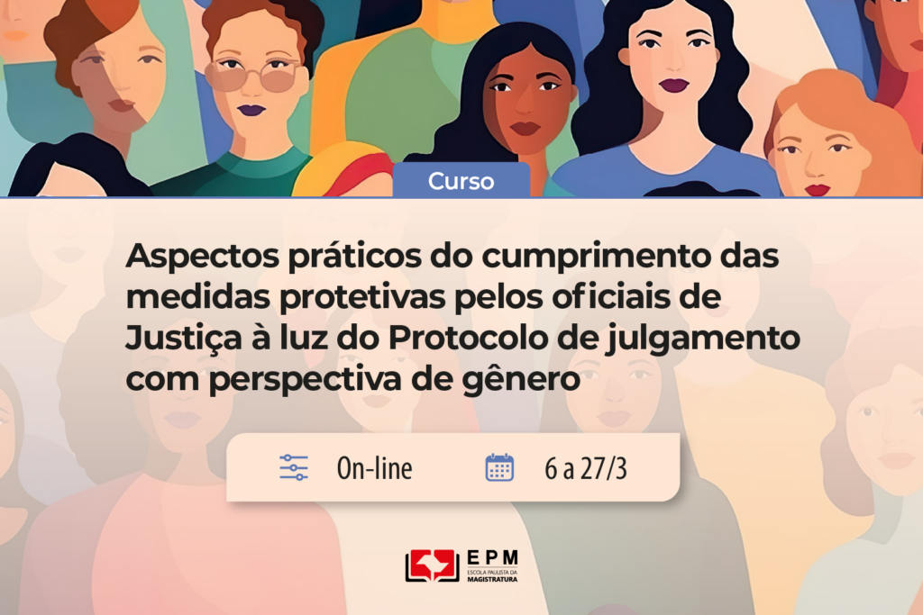 Resultado de um projeto do curso de Formação de Formadores (FOFO3) e de uma construção conjunta entre Juízas e Juízes e Oficiais de Justiça, o curso “Aspectos práticos do cumprimento das medidas protetivas pelos oficiais de Justiça à luz do Protocolo para Julgamento com Perspectiva de Gênero” está com inscrições abertas até 3/3 no site da Escola Paulista da Magistratura (EPM). Gratuito e voltado tanto aos Oficiais de Justiça quanto ao público interessado, o curso dispõe de 3 mil vagas. As aulas serão ministradas de 6 a 27/3, das 9h às 12h, pela plataforma Teams.