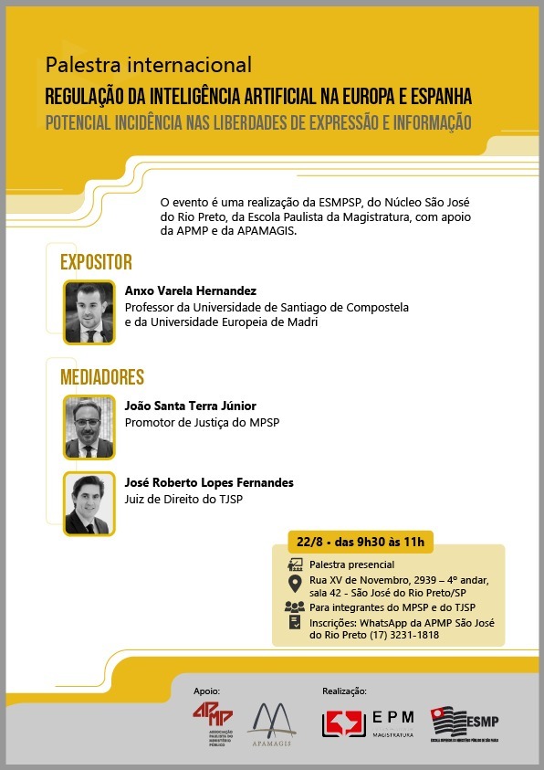 No dia 22/8, a Escola Superior do Ministério Público de São Paulo, o Núcleo São José do Rio Preto e a Escola Paulista da Magistratura, com apoio da Apamagis e da Associação Paulista do Ministério Público, regional de São José do Rio Preto, promovem a palestra “Regulacion de la IA em Europa y España y su potencial incidência em las liberdades de expression e información”, proferida pelo Jurista espanhol Anxo Varela Hernandez, Professor nas Universidades de Santiago de Compostela e Europeia de Madri.
